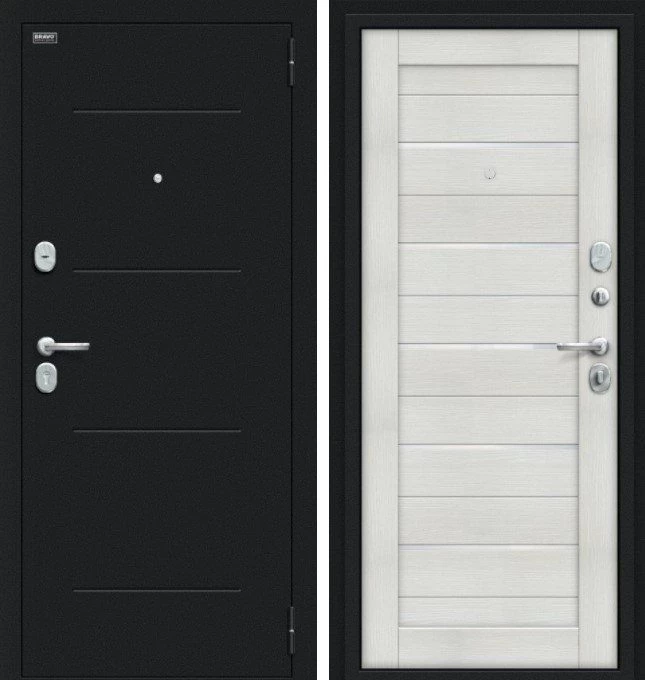 Надежная входная Браво Техно Kale Букле черное/Bianco Veralinga премиум класса по цене 36 350 руб. Большая толщина стали защитит от проникновения в ваш дом, квартиру или коттедж. Используется очень качественная фурнитура: замки, цилиндры, ручки, защелки. Покрытие и отделка двери изготовлено под внимательным контролем производителя. Дверь имеет долгий срок службы и гарантию.