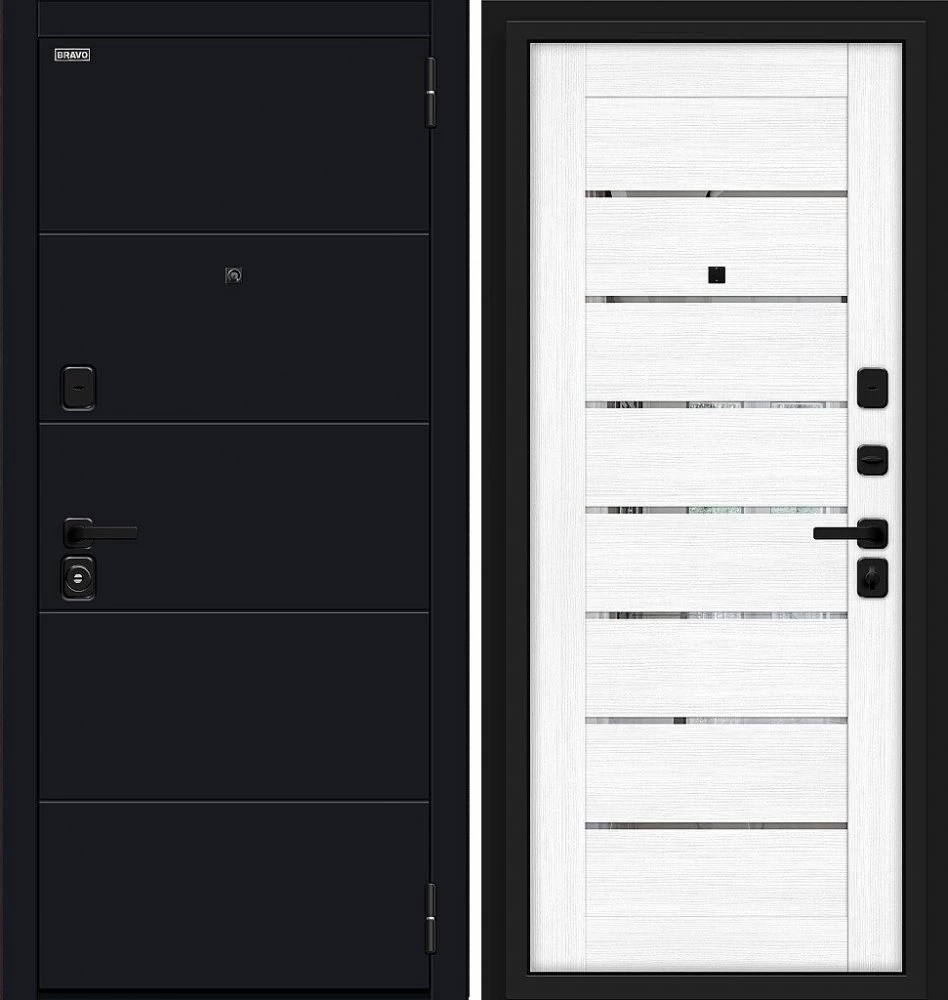 Надежная входная Дверь Браво Прайд Total Black/Snow Melinga премиум класса по цене 41 950 руб. Большая толщина стали защитит от проникновения в ваш дом, квартиру или коттедж. Используется очень качественная фурнитура: замки, цилиндры, ручки, защелки. Покрытие и отделка двери изготовлено под внимательным контролем производителя. Дверь имеет долгий срок службы и гарантию.